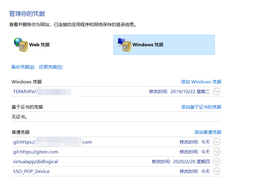另外中途操作可能遇到要认证的问题,密码输错了不知道在哪改,可以直接在控制面板-用户账户-管理windows凭据中修改