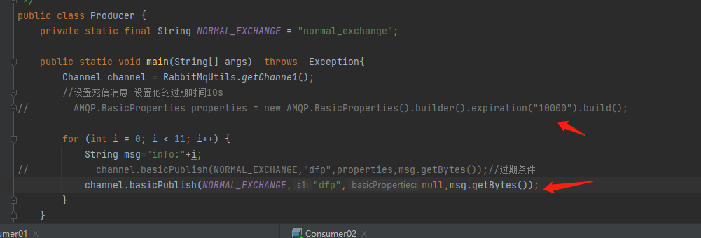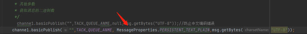 channel.basicPublish("",QUEUE_NAME,null,msg.getBytes());//二进制传输