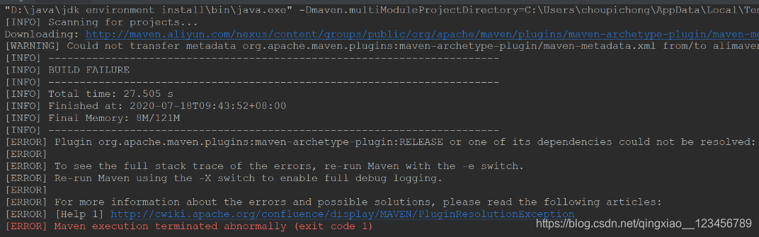 错误显示的主要意思是说访问不到阿里的镜像服务器,然后一些依赖的包就下载不下来。搜索到的解决方案主要是说maven里的settings文件中没有配置阿里的镜像服务器,也有的说是网速的问题,这两个地方我都测试过,但是都没效果,