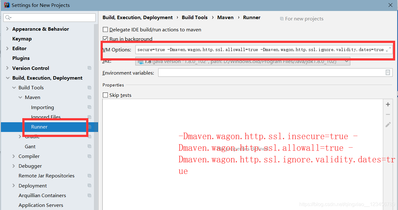 如上图所示进入Maven->Runner 然后将下面内容复制粘贴到VM Options当中保存即可。
