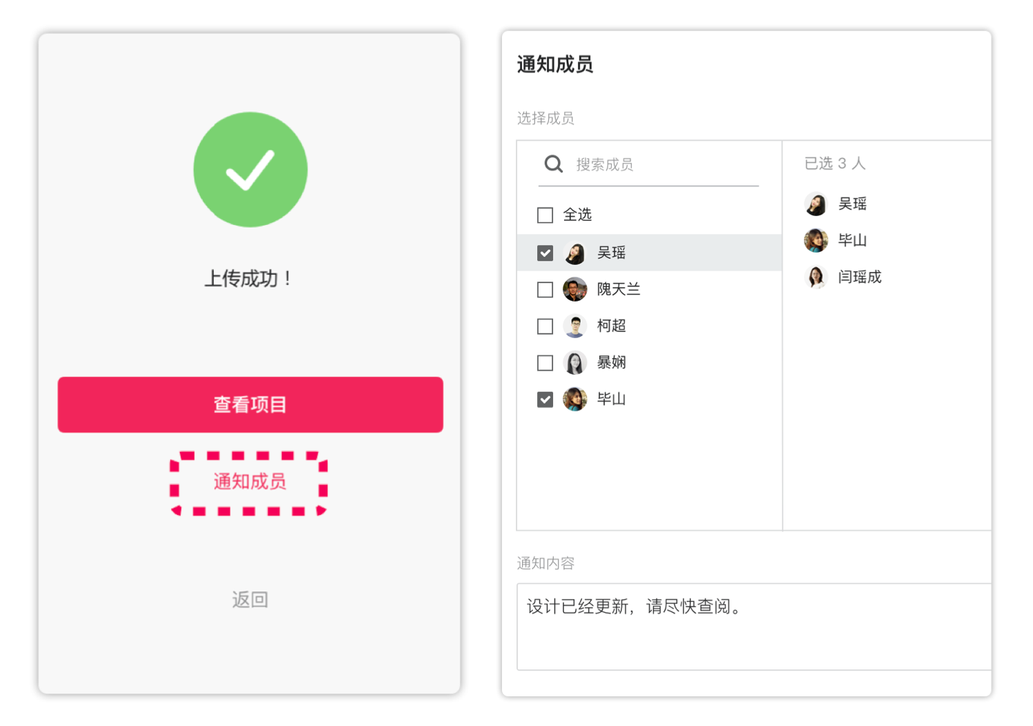 摹客插件新增了"通知成员"的选项,设计稿成功上传后,可指定团队中的成员接收更新通知,同时还可以添加具体更新内容,信息对称更有保障。