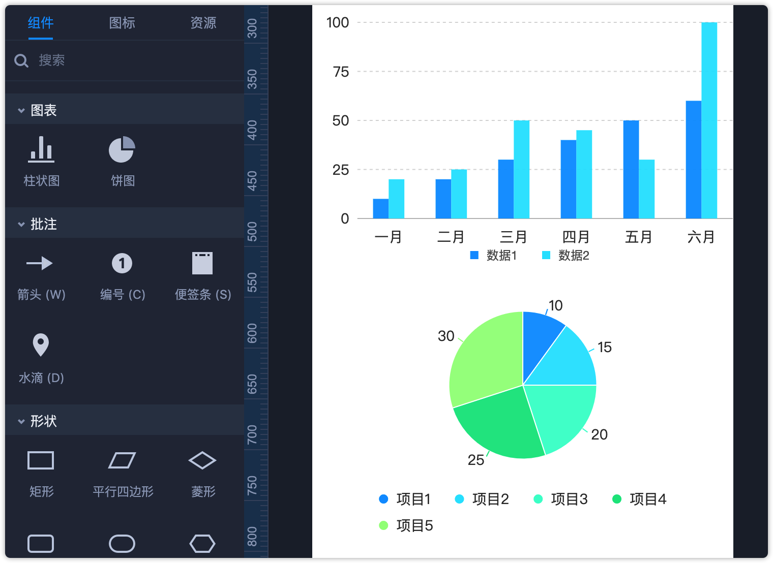 随着数据可视化的流行,在原型设计时对动态图表组件的需求也越来越大。本次更新,摹客RP上线了柱状图和饼状图两个图表组件,可以自定义样式和数值,演示时动态呈现数据。更多图表组件在后期版本中会陆续上线,敬请期待~
