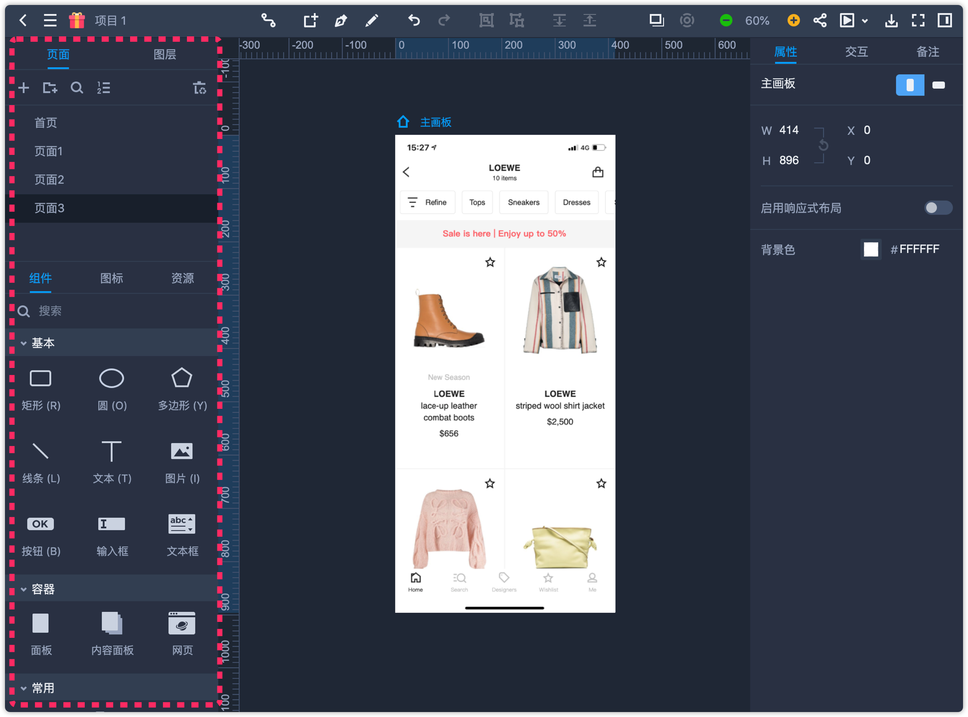 摹客RP对左侧面板的结构也进行了优化,将页面列表与组件库上下排布,切换页面的同时组件也能快速拖出使用。