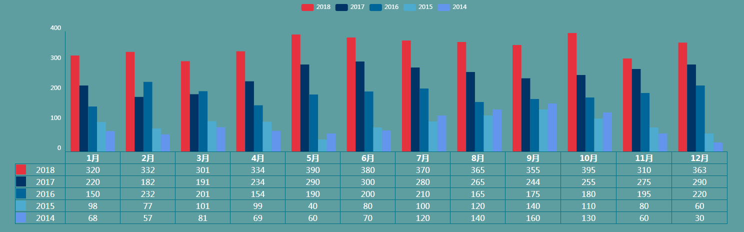 .echart-table{color: #fff; width: 100%; border:0; border-collapse:collapse; table-layout: fixed;} .echart-table > thead > tr > th{text-align: center; border: 1px solid #017081;} .echart-table > thead > tr > th:first-child{border: none; width: 98px;} .echart-table > thead > tr > th:not(first-child){width:calc((100% - 98px) / 12);} .echart-table > tbody > tr > td{text-align: center; border: 1px solid #017081;} .echart-table > tbody > tr > td:first-child{width: 98px;} .echart-table > tbody > tr > td:not(first-child){width:calc((100% - 98px) / 12);} - table随着浏览器窗口的收缩能够自适应,echart需要给图标添加监控事件来达到自适应。
