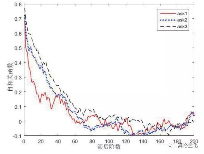 对于许多金融资产,订单簿上的订单量在不同的时间段均存在明显的自相关性,最优报价的订单量的自相关性要弱于其它的次优报价订单量的自相关性,且滞后阶数明显低于其它报价订单量的滞后阶数,这一点并不难解释,因为最优报价的订单总是最先被执行,这使得最优报价的订单量的变化速度和变化频率要远远高于其它报价。此外,可以发现在日内交易的不同时段,订单量的自相关程度和滞后阶数也有较为明显的差别,在上午刚开盘和下午刚开盘的前一半交易时段的自相关程度较低,而在后一半的交易时段内自相关性程度较高,几乎是前者的两倍;同时,在早上刚开盘的一个小时内,自相关的滞后阶数要明显大于日内的其它交易时段,显示出较强的记忆性。