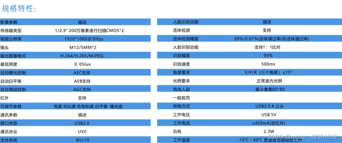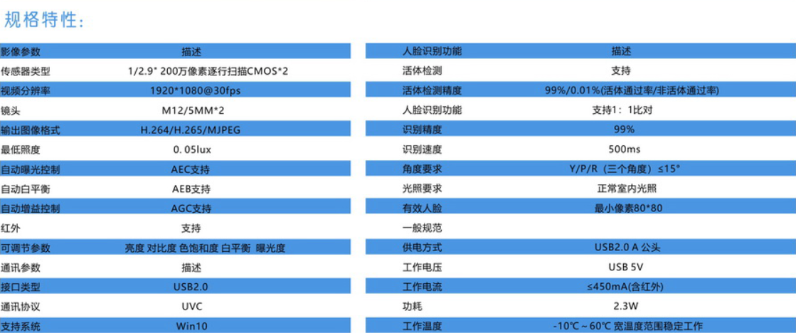 标准UVC设备,兼容性强,自带人脸识别算法,支持活体识别,支持1:1比对,不借助外部设备即可进行人脸识别,输出人脸属性值。支持活体识别,有效防止照片、视频和面具等假体攻击。