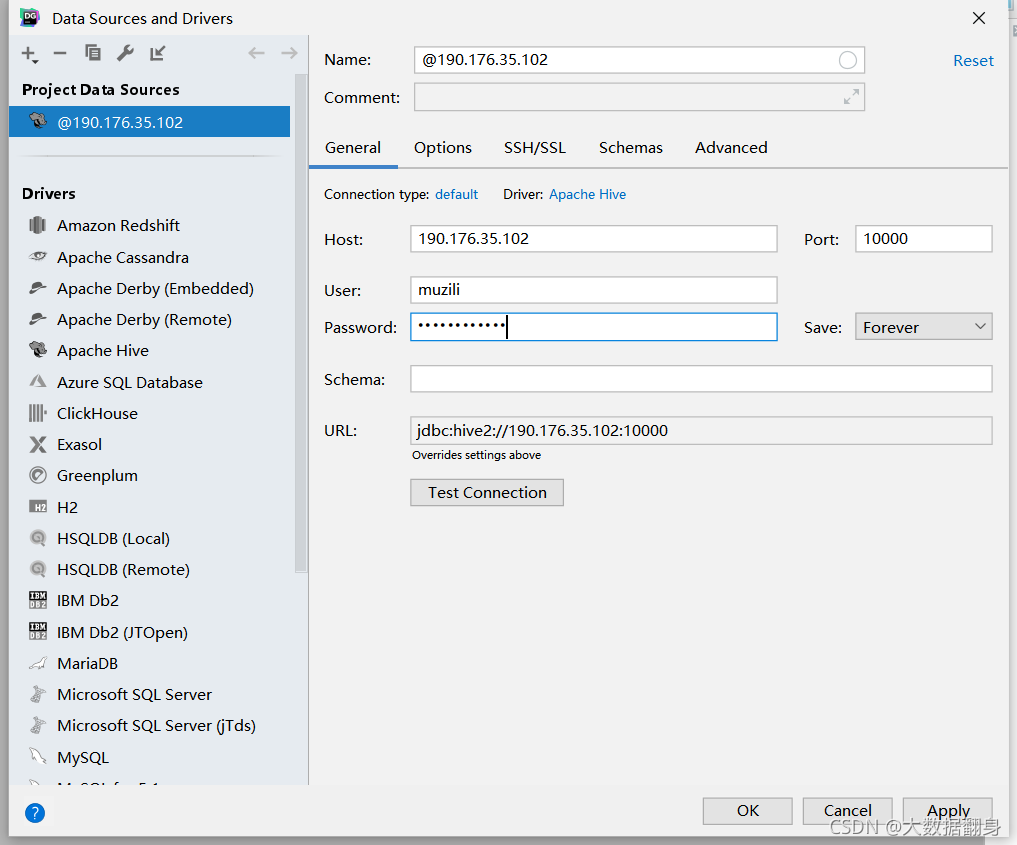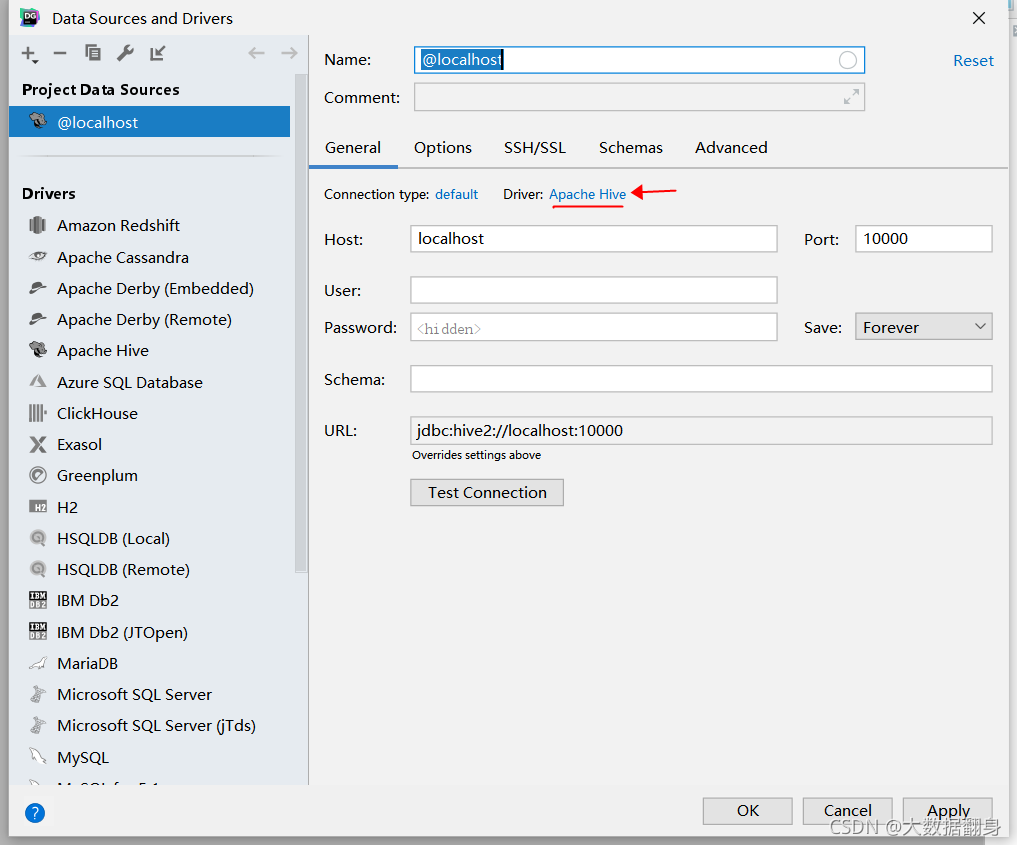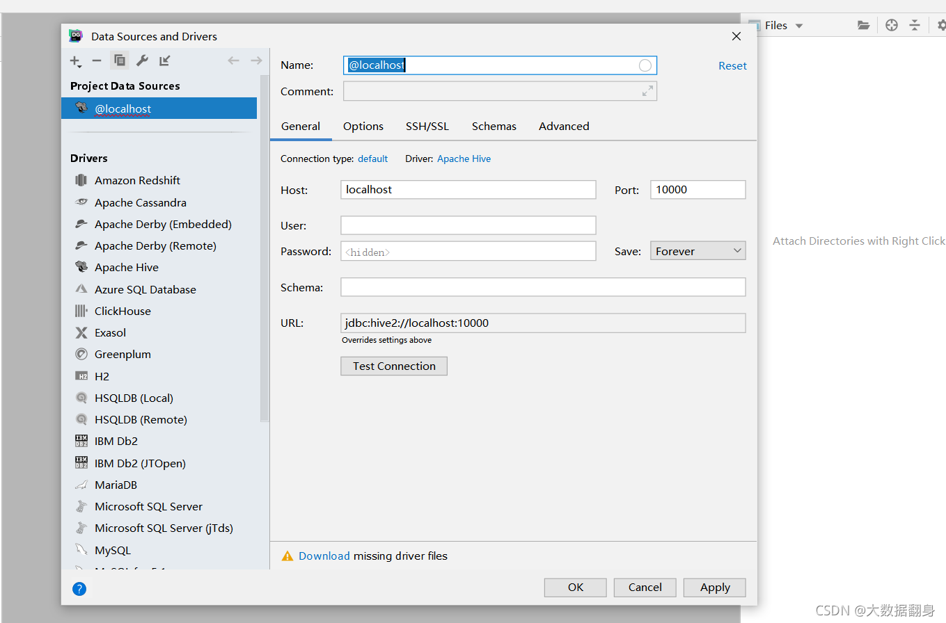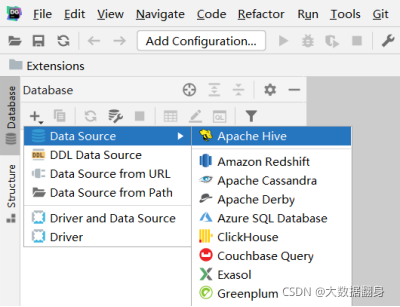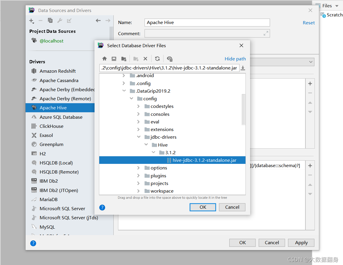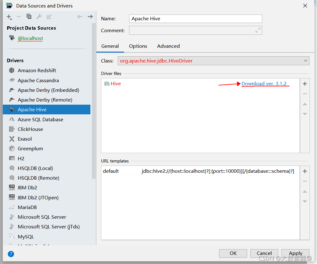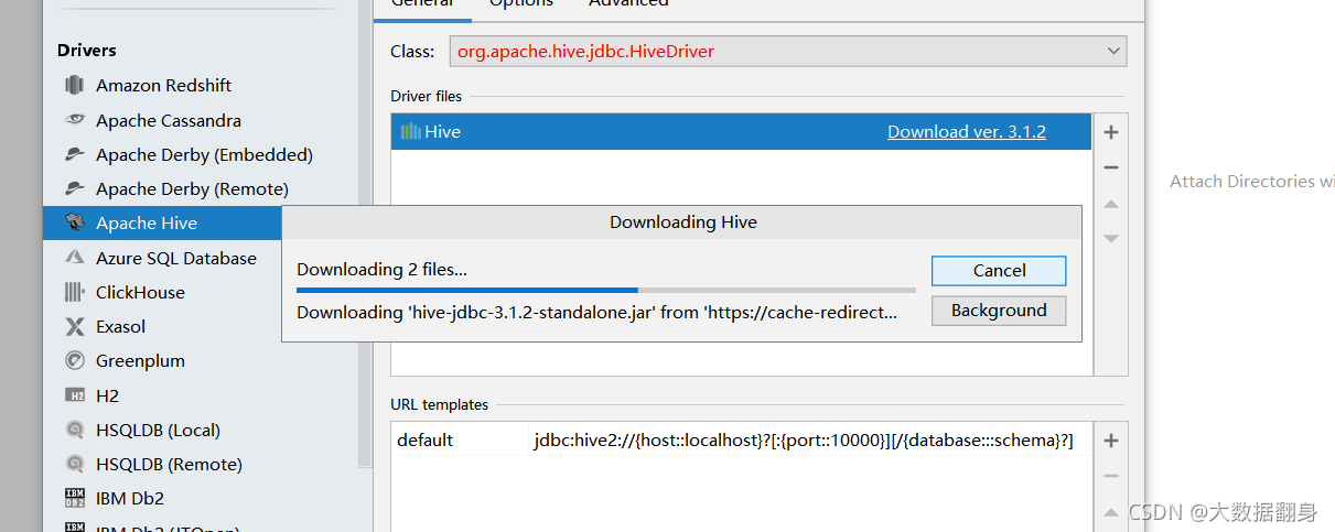 在线安装数据库驱动,点击Driver:Apache Hive