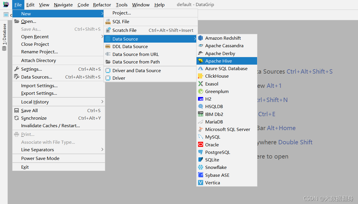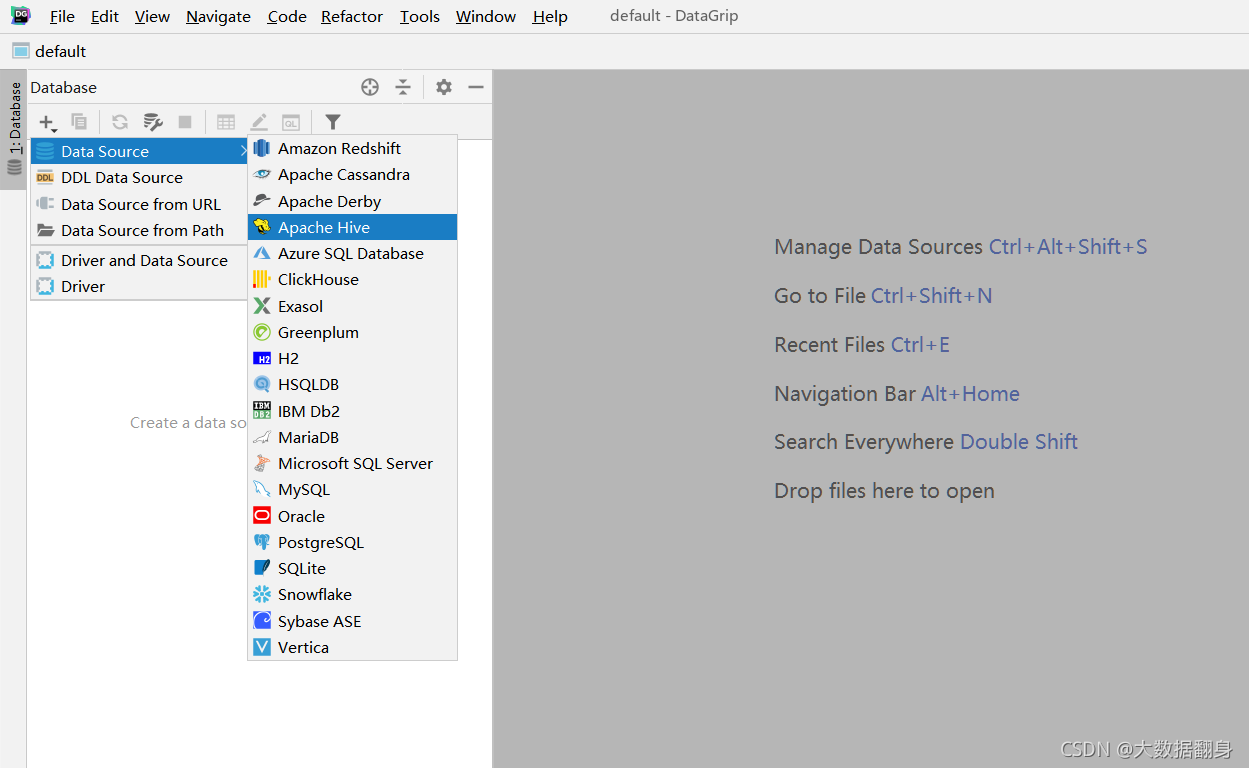 DataGrip支持主流的数据库,File -> New -> DataSource