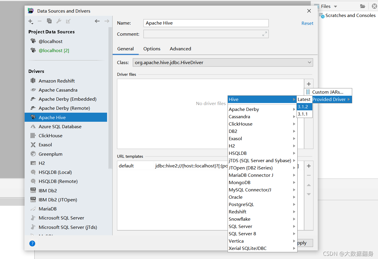 也可以选择其他版本:点击右边 + ,选择Provided Driver,选择你需要的库类型,我选的是hive,如图会提供相应的版本供选择。