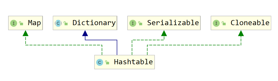 继承于Dictionary, 不可存储null键和值, 底层基于数组+链表(HashTable数据结构不同于HashMap的是,不会转化为红黑树),父类方法少于AbstractMap, 只有基本的get, put, remote, 没有putAll, keySet等, 线程安全。