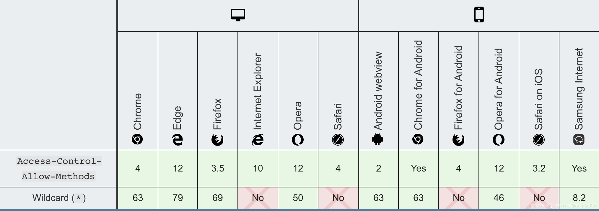 结果查找资料,发现 Access-Control-Allow-Methods 通配符 * 在IE中不会被识别,具体兼容如下图。