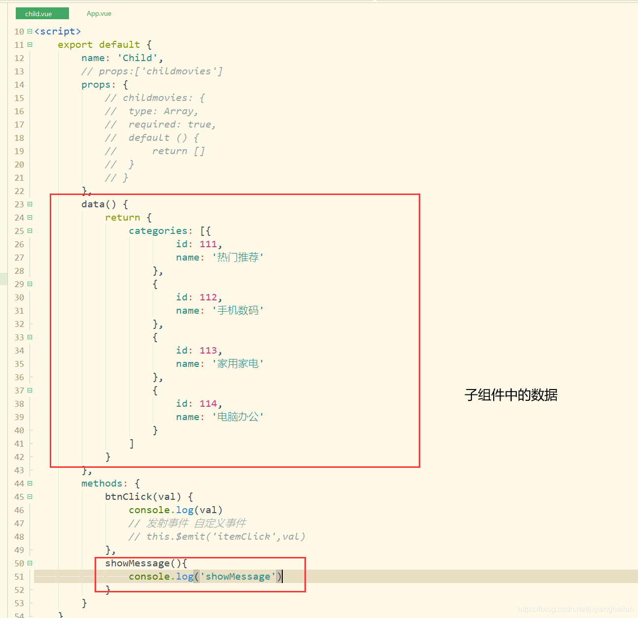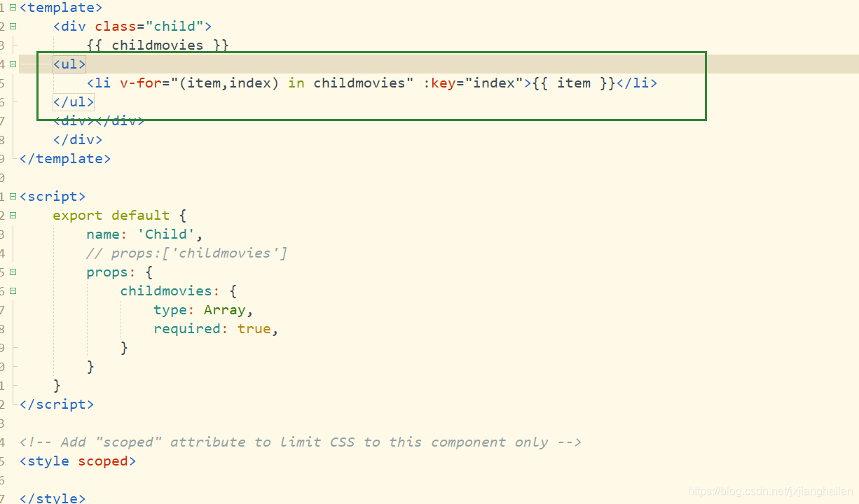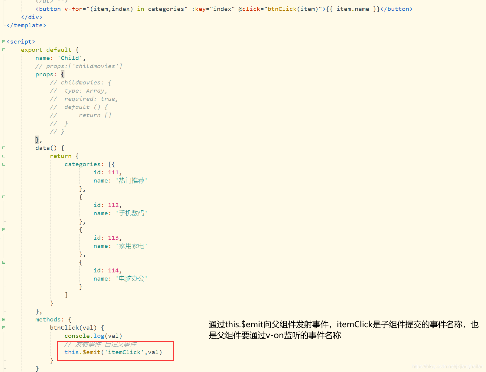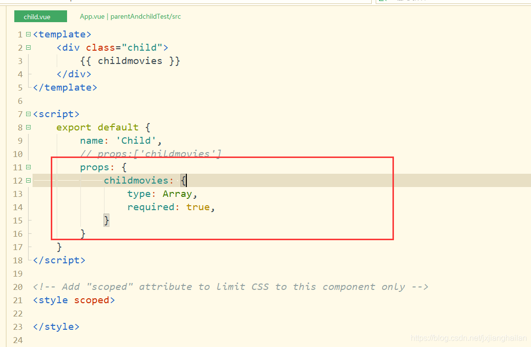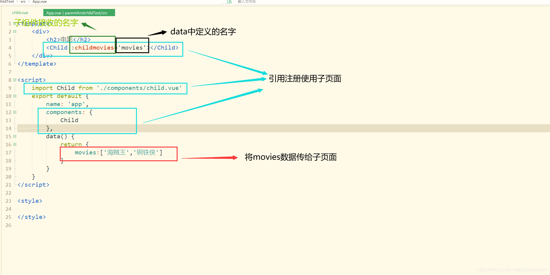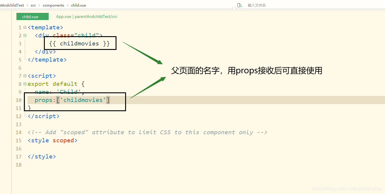 v-on绑定的属性名称childmovies与data中定义的movies名称可以不一样,也可以定义成一样的,属性childmovies通过v-bind绑定,也是子组件中通过props接收的名字,而movies是要传递给子组件。如果不用v-bind绑定childmovies。直接定义childmovies = movies那么就相当于把‘movies’传递给下一层。