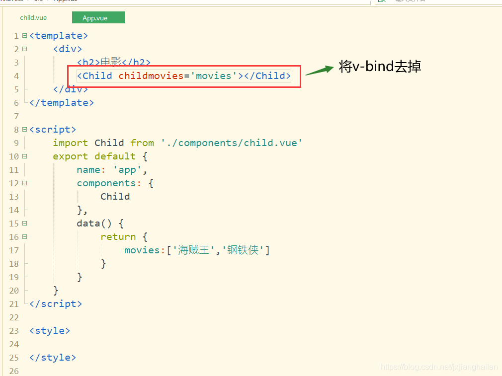 将v-bind去掉后,相当于把movies字符串传递给子页面,而不将movies当成变量去寻找,
