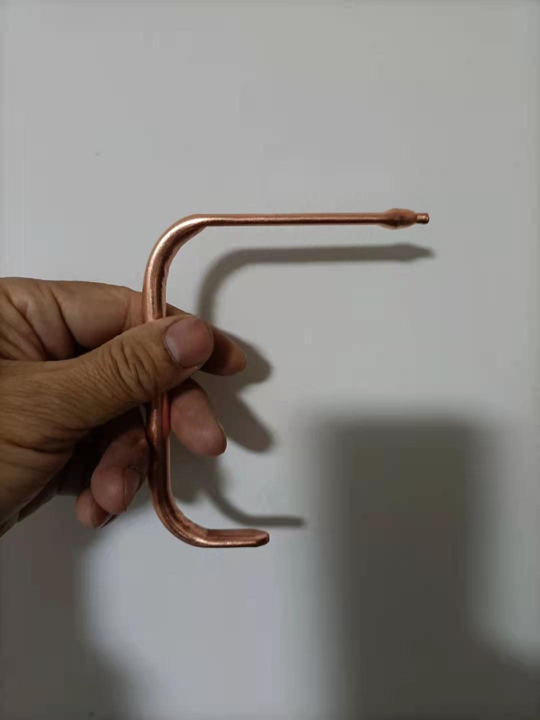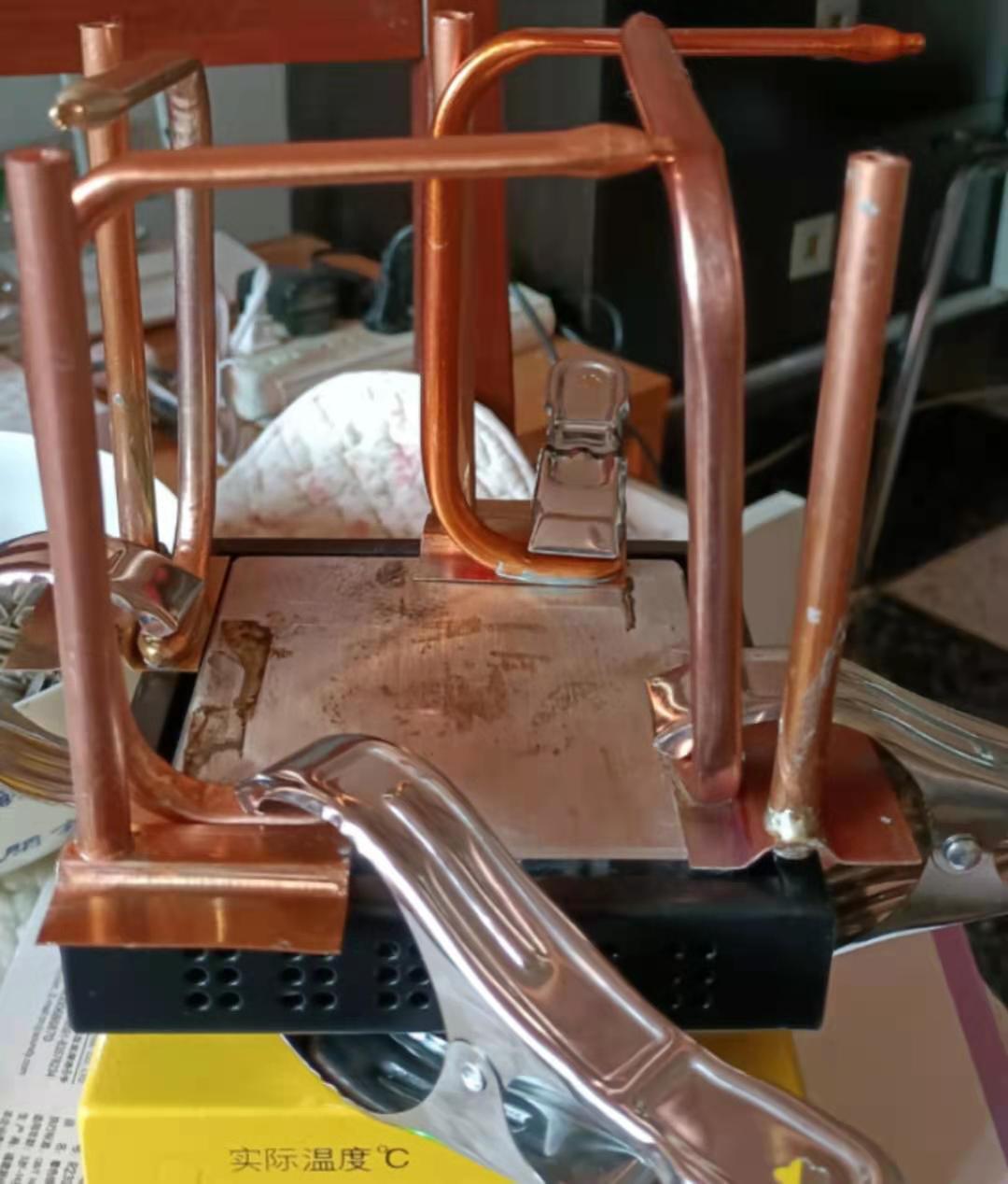 导热能力由导热系数(单位W/m.K)衡量,空气0.023 水0.59 碳钢45 铝 200 铜 397 银411。有一种材料是导热领域的超导体:相变热管,烧结铜热管导热系数可以达到20000-30000!一般CPU的散热器用6mm直径铜热管,8mm铜热管导热能力约80W,10mm铜热管导热能力约100W,越粗的热管越难弯,热管焊接网上有用热风枪的视频,我用加热台+焊锡膏焊接感觉更好,227度高温焊膏在260-300度焊接,183度中温锡膏在230度可以焊接,实际上壁厚为0.5mm的8mm铜热管相当皮实,胀管了压扁还可以用。下图一是用台钳压扁的8mm铜热管,另一个是用加热台高温锡膏焊接。