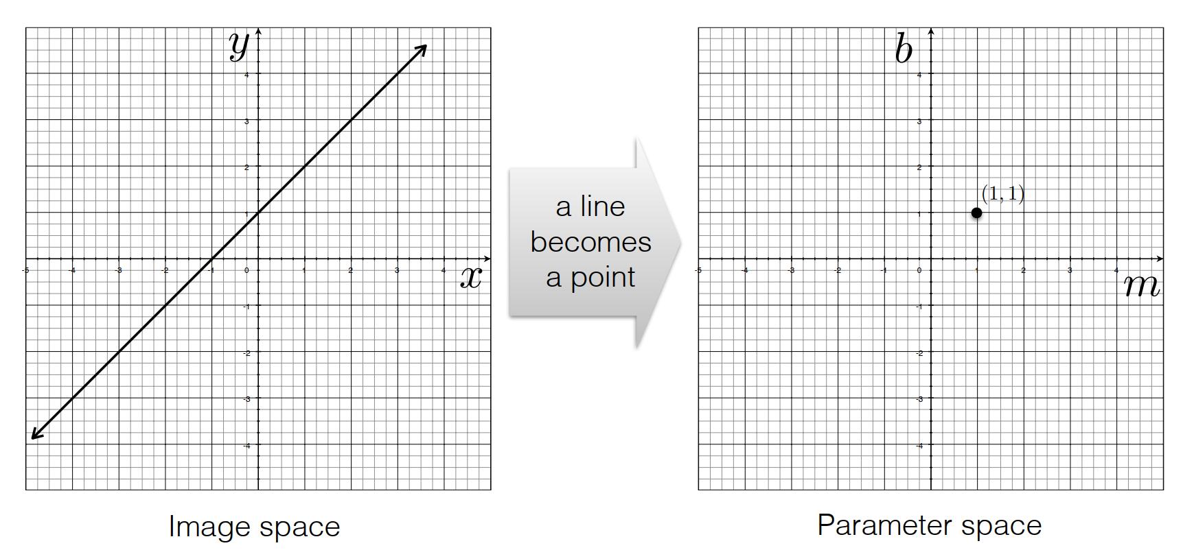 * 在图像空间中,可以用y=mx+b表示一条直线。其中,x、y为变量,m、b为参数