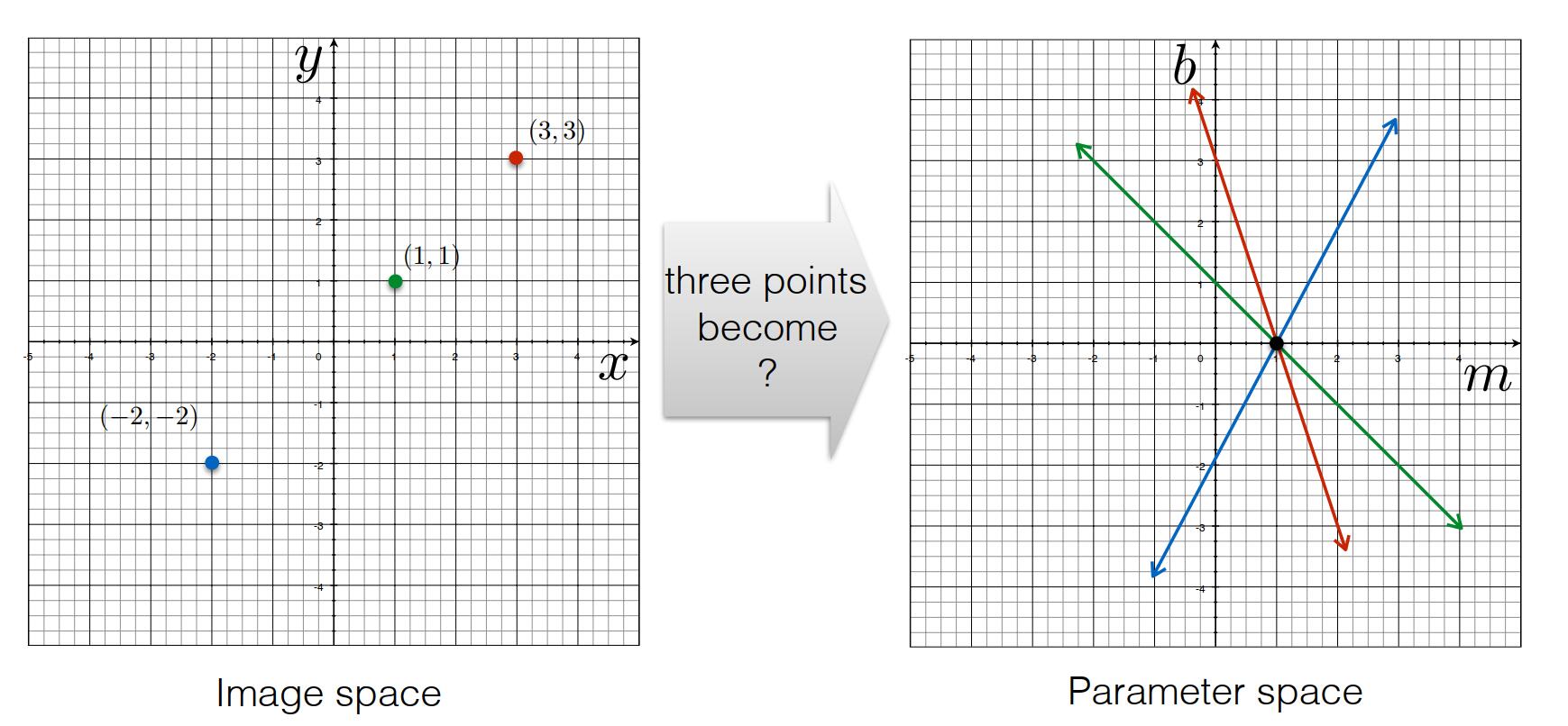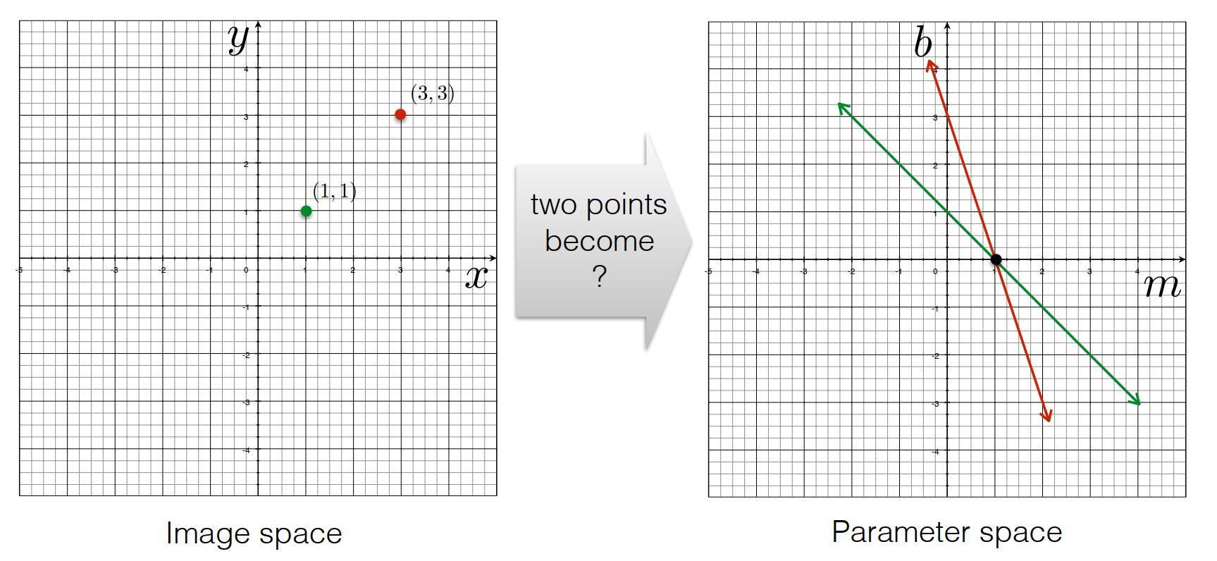 * 当图像中有两个点时,他们在参数空间中对应着两条必相交的直线,直线的交点(m,b)对应着图像空间中过着两点的直线
