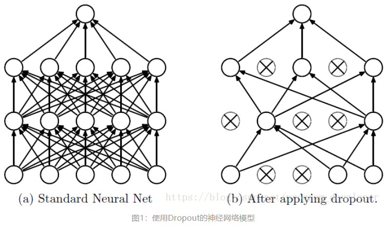 dropout通俗理解就是,在神经网络训练的时候,有时因为神经元过多,模型参数过多等原因而导致过拟合,dropout以概率p让一部分神经元失活,从而达到降低过拟合的效果。如下图所示,使用dropout后,一部分神经元不参与训练。