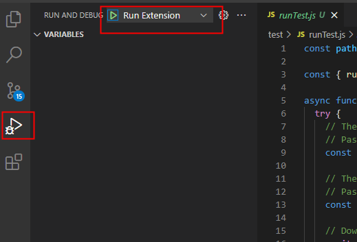 用vscode打开生成的项目,使用F5或者点击下图位置run起来,这时候会新起一个插件开发的新窗口