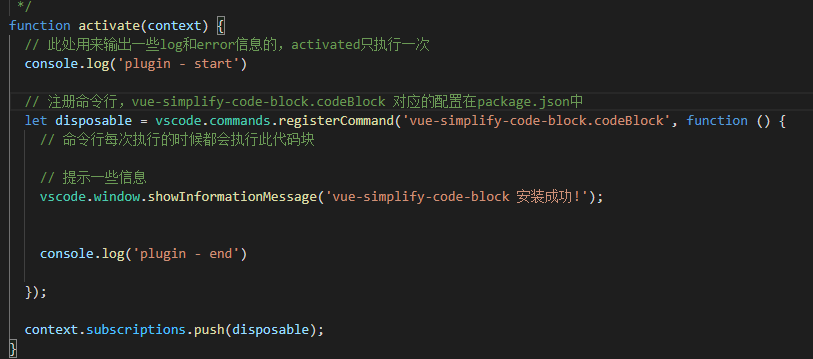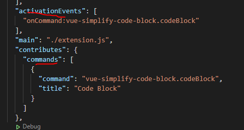 在extension.js里会去注册命令行,然后找到package.json里对应的activationEvents,然后输入的Hello World(Code Block)对应的就是commands中,当然,你也可以注册多个,然后在activationEvents和commands配置多个即可。