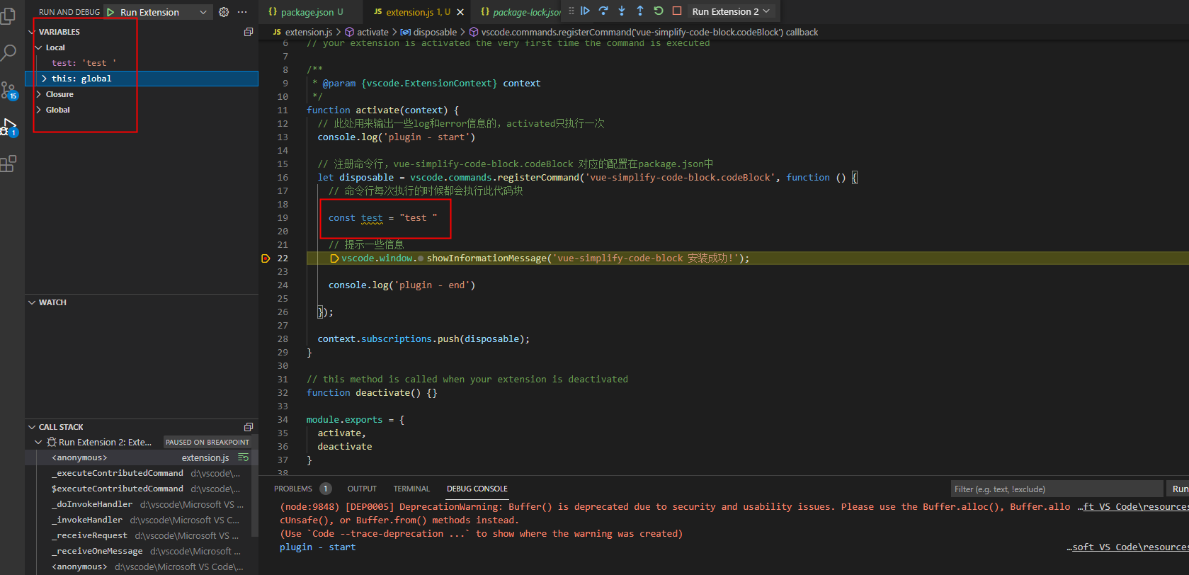 这里最主要的两个文件是extension.js和package.json(截图时项目已替换成Code Block关键字)