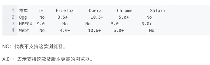 一共支持三种格式: Ogg、MPEG4、WebM。但这三种格式对于浏览器的兼容性却各不同。