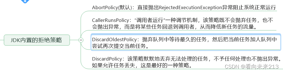 2.4如果队列满了且正在运行的线程数量大于或等于maximumPoolSize,那么线程池会启动饱和拒绝策略来执行。