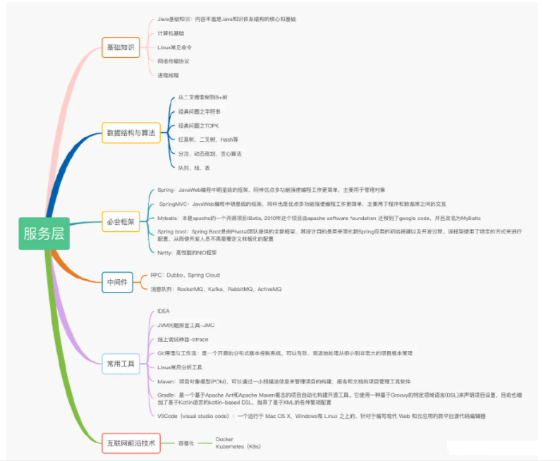 这一层有点东西了,算是整个框架的核心,如果你跟我一样以后都是从事后端开发的话,我们基本上整个技术生涯,大部分时间都在跟这一层的技术栈打交道了,各种琳琅满目的中间件,计算机基础知识,Linux操作,算法数据结构,架构框架,研发工具等等。