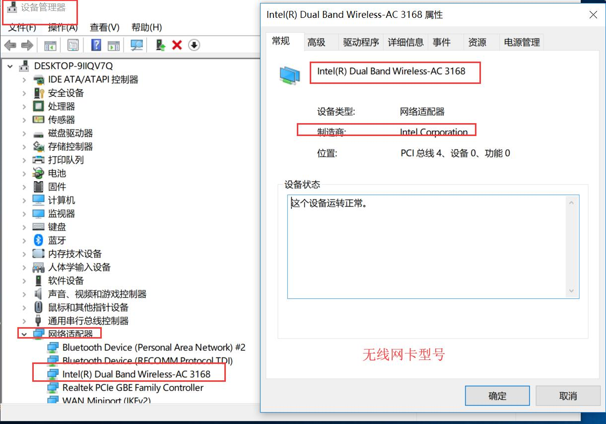 设备管理器-》网卡配置-》无线网卡-》右键属性-》查看型号为:Intel Dual Band Wireless-AC 3168.
