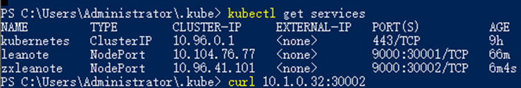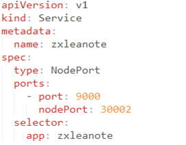 运行kubectlcreate命令进行创建:kubectlcreate -fleanote_service.yaml type=NodePort和nodePort=30001的两个属性,表明此Service开启了NodePort方式的外网访问模式。在k8s集群之外,比如在本机的浏览器里,可以通过30002这个端口访问zxleanote,(对应到9000的虚端口上)。所以前面要关闭防火墙。