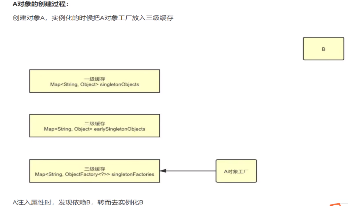 如果没有获取到,也就是缓存中没有这个bean对象,那就先实例化A,然后再放入三级缓存中。