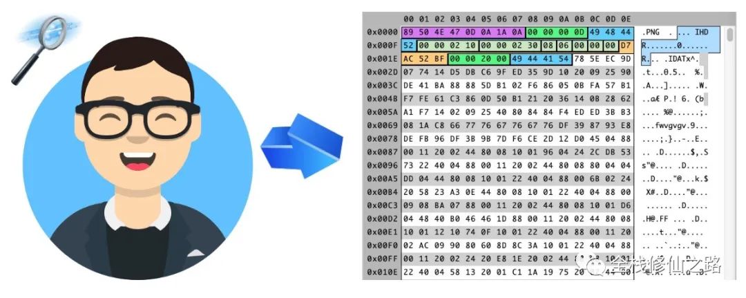 要查看图片对应的二进制数据,我们就需要借助一些现成的编辑器,比如 Windows 平台下的 「WinHex」 或 macOS 平台下的 「Synalyze It! Pro」 十六进制编辑器。这里我们使用 Synalyze It! Pro 这个编辑器,以十六进制的形式来查看阿宝哥头像对应的二进制数据。