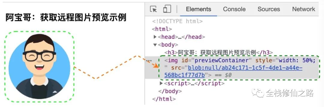 通过使用 Chrome 开发者工具,我们可以在 Elements 面板中看到 Object URL 的 「“芳容”」: