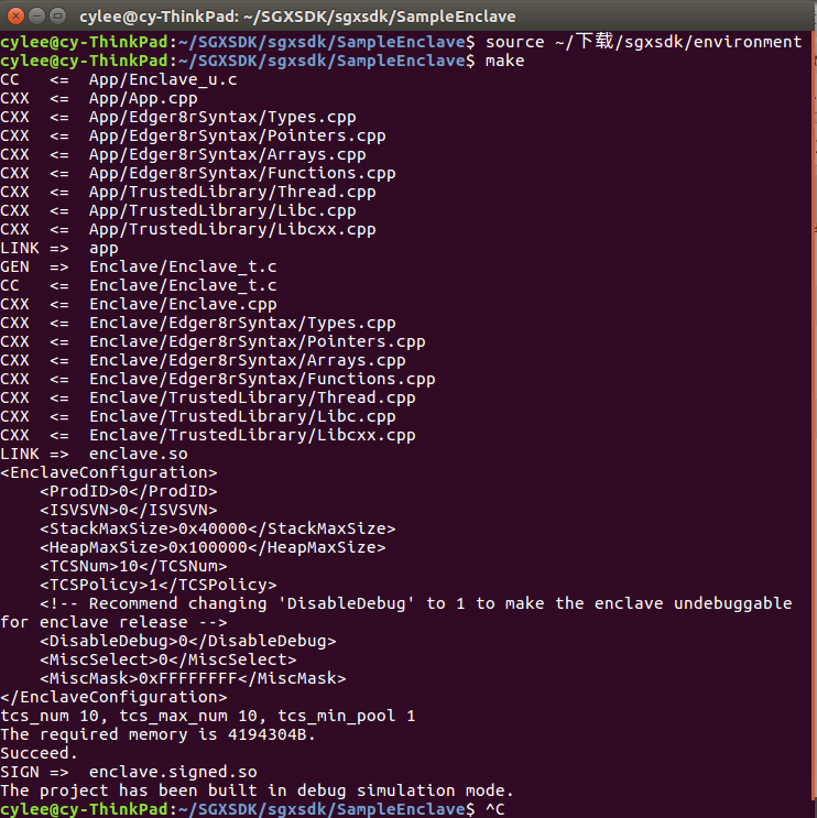 终端进入到~/SGXSDK/sgxsdk/SampleEnclave目录下(cd或在文件夹中右键在终端打开,进行环境变量设置: