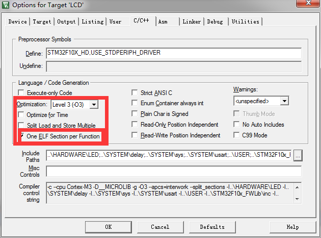c/c++选项卡中勾选one 。。。优化等级设置位0—3,等级越高对代码严谨程度越高。
