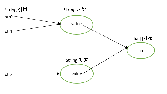 System.out.println(value0 == value2);这个代码的结果是false true,说明str0和str2是两个独立的对象,但是value字段是公用的。这段代码在内存图解如下: