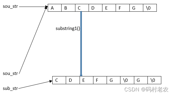 sou_str:ABCDEFG这段代码跟之前的最大的区别就在于它用macllo函数重新申请了一段内存来存在截取后的字符串,这样存储原始字符串的字符数组里面的数据并没有发生变化。