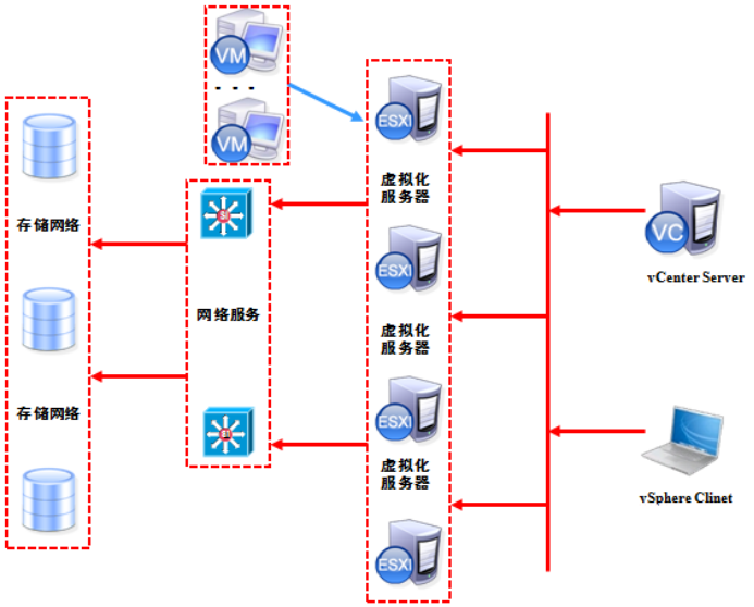 分为虚拟化服务器、网络服务、存储网络、集中式管理服务器、客户端