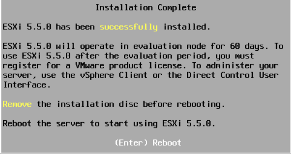 4.按提示安装即可,如图esxi5.5已经安装完成,并且提示60天的评估期,按enter键重启服务器
