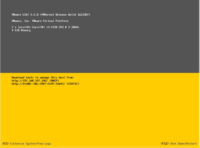 5.首次进入esxi5.5主界面,在主界面可以看到esxi的版本号、cpu、内存、ip地址等信息