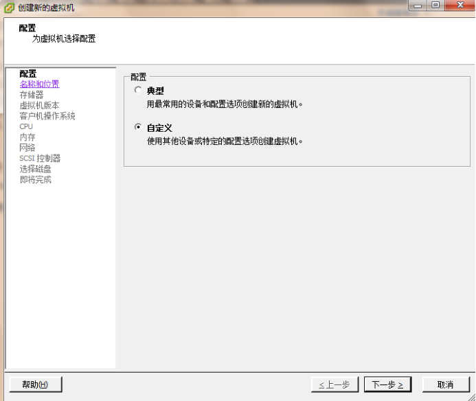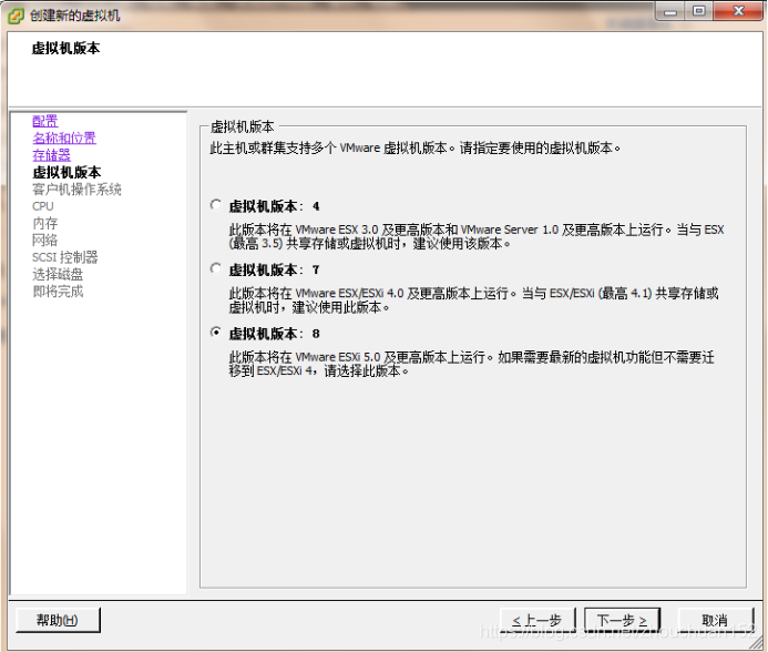 1.新建虚拟机,客户机操作系统选择VMware ESX系统,版本选择5,并将esxi5.5的iso光盘镜像放入光驱,硬盘100GB,基本步骤省略