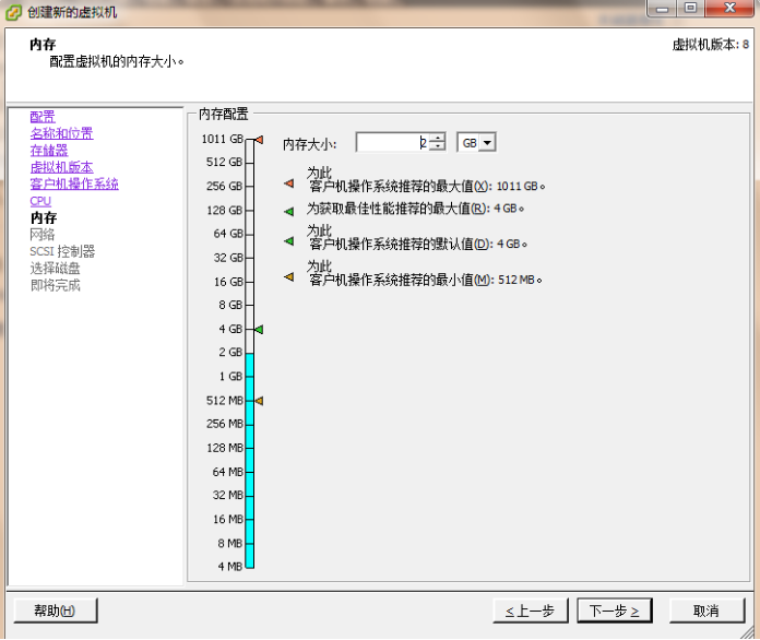 7.虚拟机内存的的最大值由esxi5.5物理机和虚拟硬件版本决定,版本8支持1011GB,版本7支持255GB,版本4支持65532MB