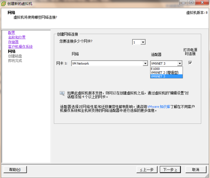 8.网卡选择,除了e1000其他都要安装vmwaretools才可以使用,本例选e1000