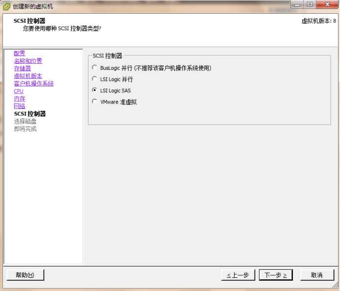 9.配置scsi控制器类型,其中lsilogicsas和vmware准虚拟只适合虚拟硬件版本为7或更高版本的虚拟机,此处选lsi logic sas