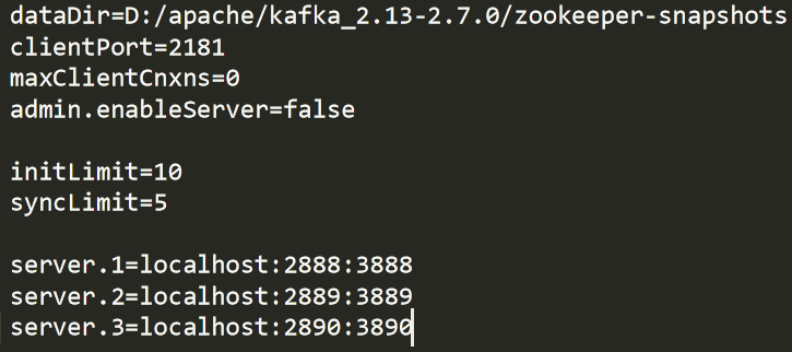3.现在kafka中自带zookeeper,不需要单独下载(单独下载部署请看之前发的zookeeper集群部署),zookeeper配置文件为:kafka_2.13-2.7.0-2\config\zookeeper.properties
