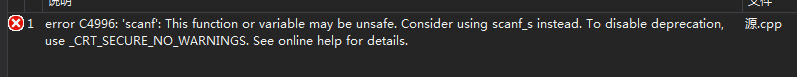 当我们使用Visual Studio 编写程序的时候,使用输入函数scanf()时常会出现报错,查看报错信息可以知道,系统给出了两个解决方案。