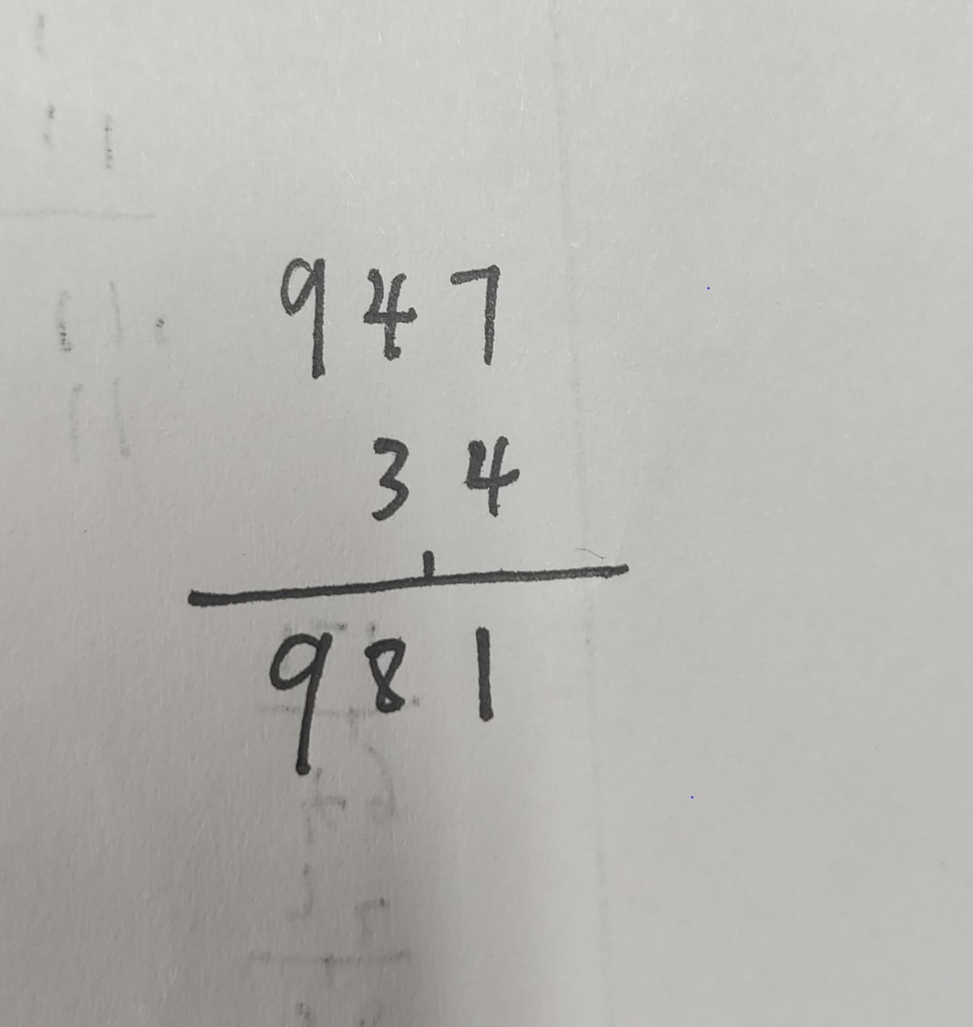 其实也很简单,首先,既然普通的数据类型不够大,那么我们干脆用数组来存储,这样就解决了数据溢出的问题。其次,要怎么进行计算呢?就是用小学学加法时候的笔算用代码表示出来。比如小学计算947+34=?这个问题时: