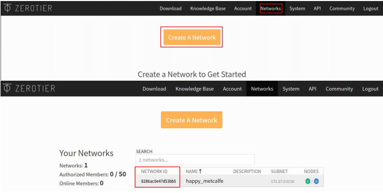 1) 登 录 zerotier 官 网 https://my.zerotier.com/network , 注 册 登 录 后 点 击 Network->Create A Network,创建一个虚拟局域网