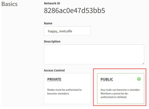 2) 点击进入网络控制台页面,可以把隐私选项设置为公共,这样加入的网络节点 就不需要验证