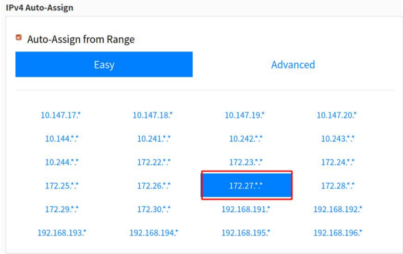 3) 下面自动分配地址这里可以自己选择网段,此处选择的是 172.27.*.*