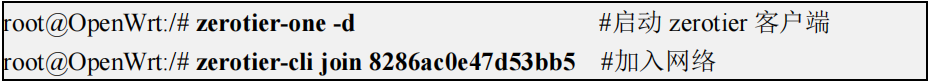 4) 在 OpenWRT 终端输入下面命令就可以加入到上面创建的虚拟局域网,其中 8286ac0e47d53bb5 是上面创建的虚拟局域网的 Network ID